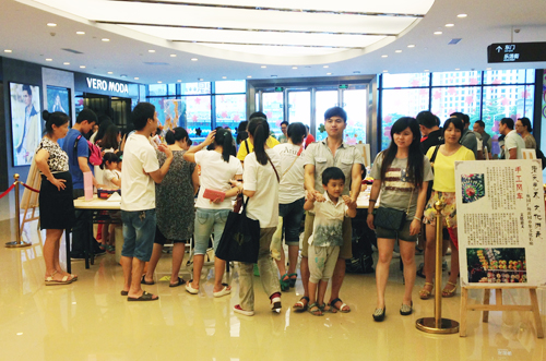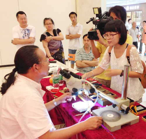 6月2日,著名書法家、篆刻家、微雕藝術家朱德祥親臨奧園廣場,并現場展示了近期創作的微雕作品,微雕媒介有印章、壽山石、象牙、中國扇等,圖案包括佛語心經、詩歌、山水畫等等。如果不是現場觀看,真的很難想象偌大一幅山水、人物畫可以用純手工雕刻在小小一塊壽山石上,朱老師巧奪天工的作品令現場觀眾的贊不絕口。