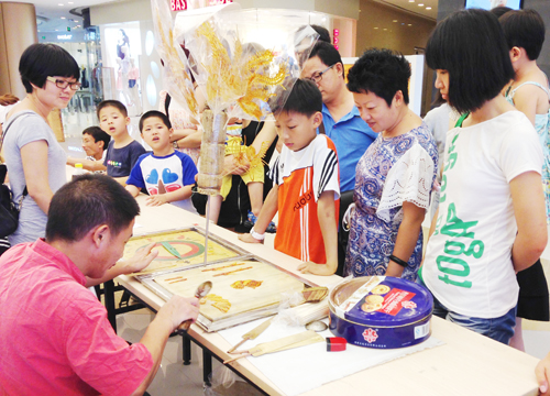 十個項目中,又數畫糖畫和米上刻字最受歡迎。糖畫的糖料一般是在紅、白糖中加上少許飴糖放在爐子上用溫火熬制,熬到可以牽絲時即可以用來澆鑄造型。在繪制造型時,由藝人用小湯勺舀起溶化的糖汁,在石板上飛快地來回澆鑄,畫出造型。負責制作糖畫的林老師還是業內小有名氣的專家,活動當天,廣東電視臺對林老師還進行了專門采訪。我們平時吃的糖畫都是2D平面造型,可是林老師有一項絕活——3D造型,草蜢、鳳凰、花朵……只要你想得到的,林老師就可以做出來?!疤钱嬢d滿我們兒時的回憶,今晚注定失眠了?!被顒咏Y束后,網友通過微博向奧園廣場表達游園市集帶給她的感動。