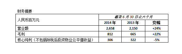 2014年上半年,本公司繼續(xù)取得理想的經(jīng)營業(yè)績,營業(yè)額為約人民幣26.58億元,同比增加24%。毛利增長22%至人民幣8.12億元,毛利率約30.5%,與去年同期基本持平。凈利潤為約人民幣3.20億元,核心純利(不包括除稅后投資物業(yè)公平值收益)為約人民幣3.06億元。