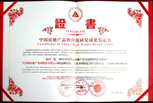 “2014中國(guó)房地產(chǎn)華南品牌價(jià)值TOP10”證書(shū)