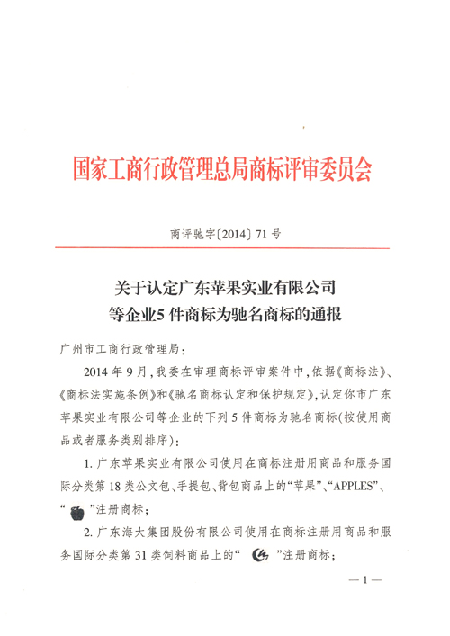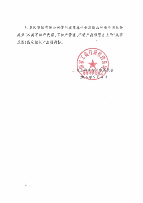 (2014年11月19日——廣州)11月16日,國家工商行政管理總局商標評審委員會下發廣州市工商行政管理局的《關于認定廣東蘋果實業有限公司等企業5件商標為馳名商標的通報》。根據通報,國家工商行政管理總局商標評審委員會認定奧園集團有限公司使用在商標注冊用商品和服務國際分類第36類不動產代理、不動產管理、不動產出租服務上的“奧園及圖(指定顏色)”注冊商標為“中國馳名商標”。