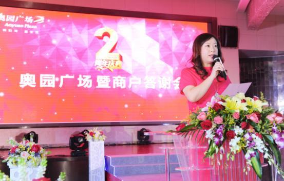 晚宴上,奧園廣場商管公司總經理姜惠女士代表奧園廣場對蒞臨現場的各位嘉賓及領導表示歡迎,并對奧園廣場作為奧園“商住雙線發展”重要戰略標桿項目,在過去兩年取得的飛躍發展做出總結,對未來做出展望,向攜手發展的商戶們表示感謝。