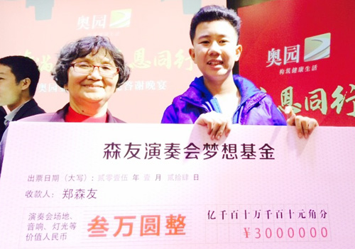 A基金首筆3萬元捐助,對象是目前就讀于北師大南國奧園實驗學校的森友。森友今年13歲,自小患有自閉癥,但他現場展現驚人的音樂才華,一曲鋼琴獨奏《時間都去哪兒了》,感動了所有業主。大家紛紛慷慨解囊,為森友計劃于今年6月份舉行的個人演奏會發起眾籌。