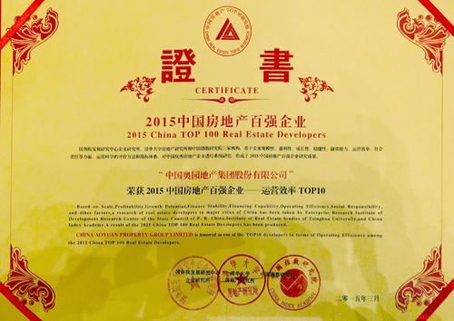 “2015中國房地產百強企業——運營效率TOP10”榮譽證書