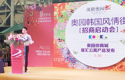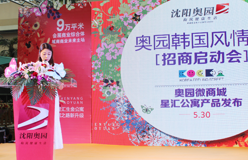 ??? (2015年5月30日——沈陽)2015年5月30日,沈陽奧園商管團隊與沈陽奧園地產營銷團隊強強聯合,隆重舉行“沈陽奧園韓國風情街招商啟動會暨奧園微商城星匯公寓產品發布會”,至此沈陽奧園的韓流微商以及投資理財新產品榮耀面世。沈陽片區總經理助理黃繼宗、沈陽商管公司籌建負責人鄂丹玲、沈陽物業公司總經理彭少良等領導出席現場,廣大投資者、商戶、業主、以及華商晨報、沈陽晚報、騰訊網、搜房網等各大媒體朋友近400人受邀光臨。