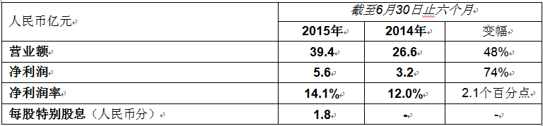 2015年上半年,本公司營業額約為人民幣39.4億元,同比增加約48%。毛利率保持穩定,約為29.4%。凈利潤約為人民幣5.6億元,按年大幅增長74%。凈利潤率為14.1%,同比上升2.1百分點。董事會建議派發特別股息每股人民幣1.8分。