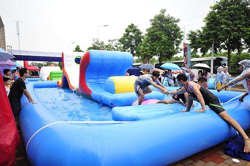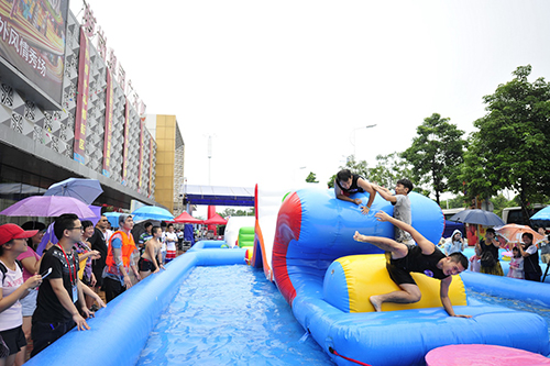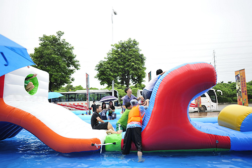 本次“水上繽FUN嘉年華”活動(dòng)中的水上大沖關(guān)環(huán)節(jié)吸引了小到六歲,大到五十多歲各年齡段人群參與,很多都是全家出動(dòng),團(tuán)結(jié)一致完成比賽項(xiàng)目。因?yàn)橄掠暝黾恿怂吓逝离y度,但參賽者們不畏艱難,互相幫助,一次次沖過(guò)難關(guān),當(dāng)完成任務(wù)時(shí),已經(jīng)全身濕透,早已分不清是雨水還是汗水,但我們都知道這是一份團(tuán)隊(duì)拼搏的喜悅。