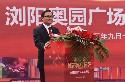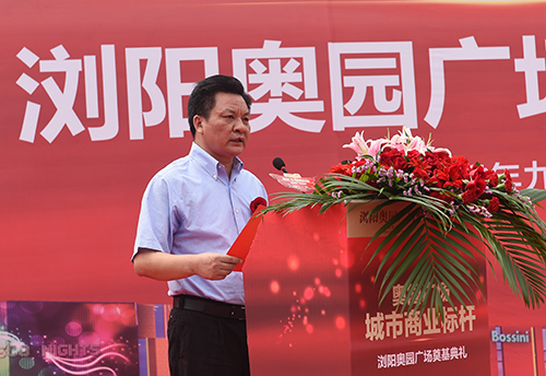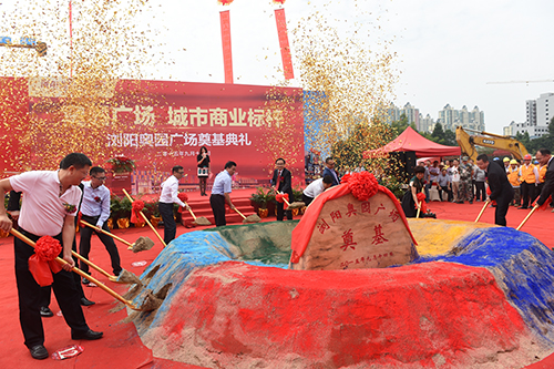 典禮上,瀏陽市政委主席李家喜先生對瀏陽奧園廣場項目給予了誠摯的祝福及充分的肯定,并希望該項目早日落成,為瀏陽的城市建設添姿加彩,提升城市品位和價值。郭總裁對瀏陽市政府給瀏陽奧園廣場的開發建設給予的傾力支持,表示了衷心的感謝。瀏陽奧園廣場必將提升本地區的城市品位和市民的生活品質,成為瀏陽的城市商業標桿和亮麗的城市名片,也成為瀏陽市民購物、休閑、娛樂、飲食、居住的首選之地。最后,參加瀏陽奧園廣場的主禮嘉賓共同為瀏陽奧園廣場項目奠基培土。
