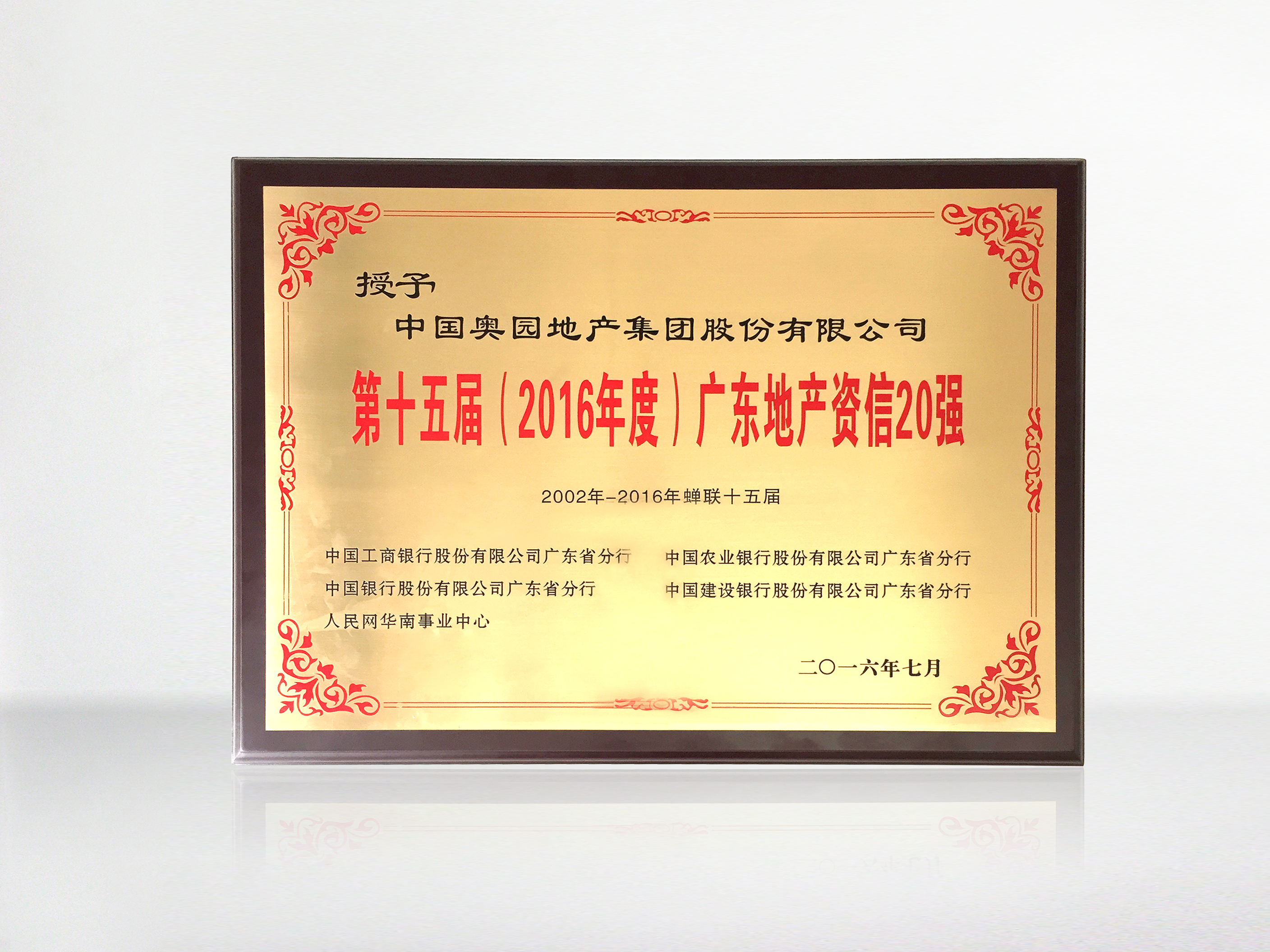 奧園集團連續十五年蟬聯“廣東地產資信20強”