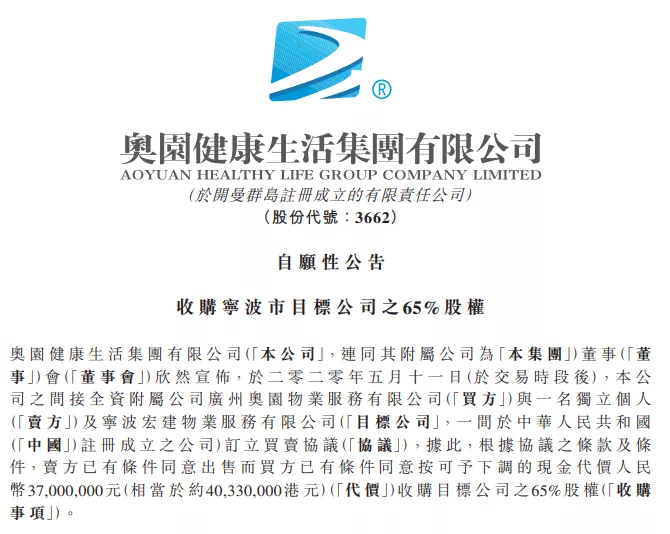 奧園健康收購寧波宏建65%股權 中國奧園加速完善旗下物管業務布局