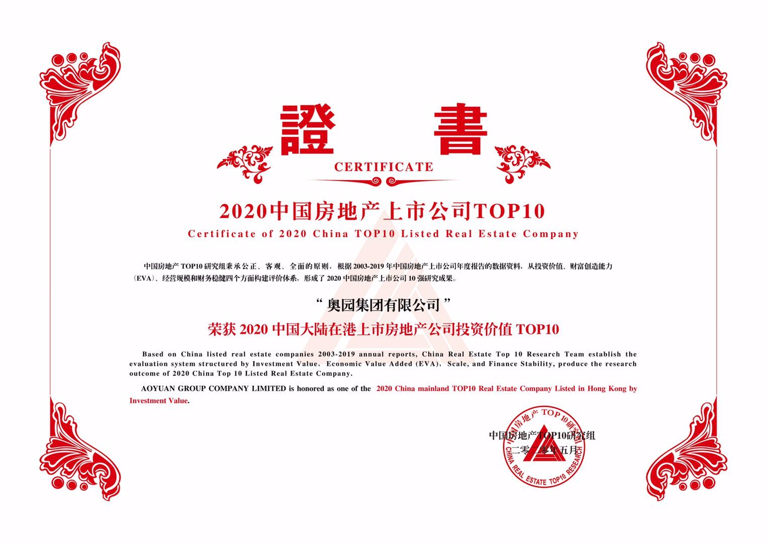 中國奧園斬獲房企投資價值、財務穩健性等五大獎項