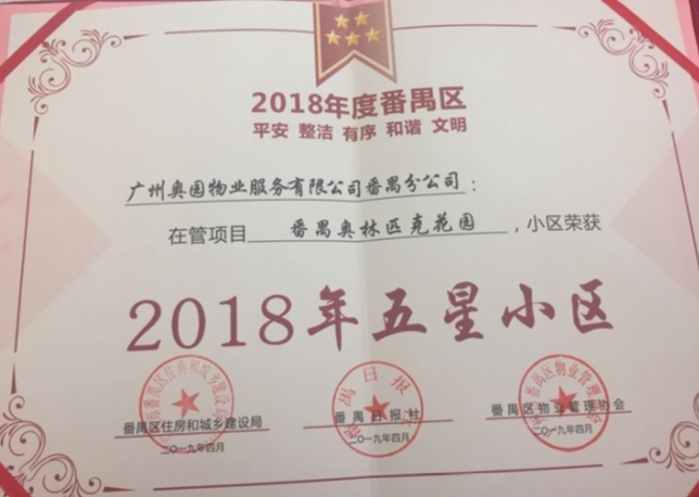 番禺奧林匹克花園獲評“番禺區2018年度五星小區”