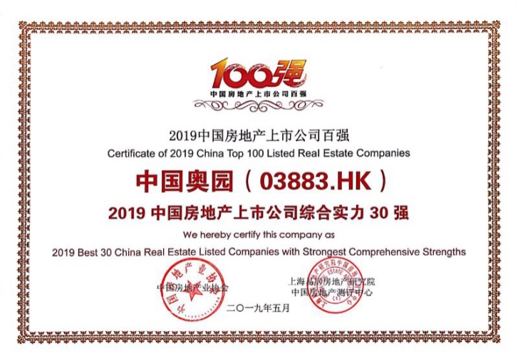 中國奧園榮獲“2019中國房地產上市公司綜合實力30強”